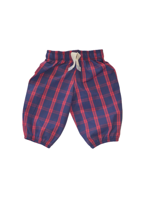 Babucha en escoces azul y rojo. Material 100% algodón; con cintura en jersey gris mélange de algodón y bolsillo en la parte de atrás.